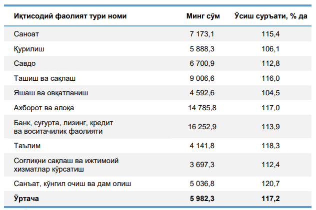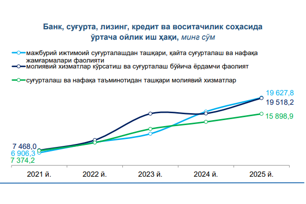 Статистика агентлиги томонидан 2025 йилнинг ўтган олти ойи учун номинал ҳисобланган ўртача ойлик иш ҳақи кўрсаткичлари эълон қилинди. Унда келтирилган маълумотларга кўра, банк, суғурта, лизинг, кредит ва воситачилик фаолияти соҳасида ўртача иш ҳақи 13,9 фоизга ўсиб, 16 млн 252,9 минг сўмни ташкил этди.